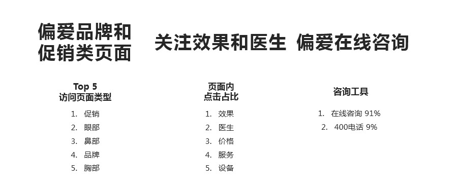 从这张图我们可以看到,用户偏好并经常访问的页面类型为促销类页面,其次是眼部医美项目的页面,而页面点击占比方面,首先关注的是医美效果,其次是医生的权威性和转型性,在咨询方面,用户其实更倾向于在线咨询的方式,你们get到了吗?
